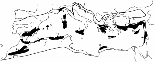 1/ Canary and Madeiran archipelago ; 2/ High and Middle Atlas ; 3/ Baetic-Riftan complex ; 4/ Maritime and Ligurian Alps ; 5/ Tyrrhenian islands ; 6/ Southern and Central Greece ; 7/ Crete ; 8/ Anatolia and Cyprus ; 9/ Syria-Lebanon-Israel ; 10/ Mediterranean Cyrenaic ; 11/ Kabylies -Numidie – Kroumiri